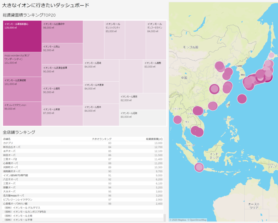 (※2020/8/25 19:00 2店舗分取得できていないレコードがあったので修正して更新しました。) 完成したダッシュボードはこちら。Tableau Publicに公開していますので推しイオンモールを探してみてください。