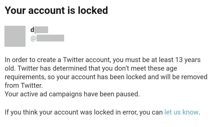 为了体验(zuo)该限制(si),两个月前,我错填了一个过去注册的 Twitter 帐号的生日,该帐号瞬间被锁定。