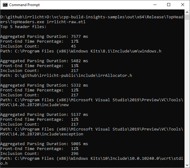 As shown below, TopHeaders correctly identifies both Windows.h and irrAllocator.h as top contributors to parsing time. We can see that they were included in 45 and 217 translation units, respectively, as we had already seen in WPA.