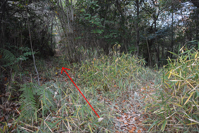 道が等高線と平行な間こそ明確な土手状の道でしたが、道が南寄りに向きを変えて谷に入ると、どこが道なんだかさっぱり分からなくなりました。