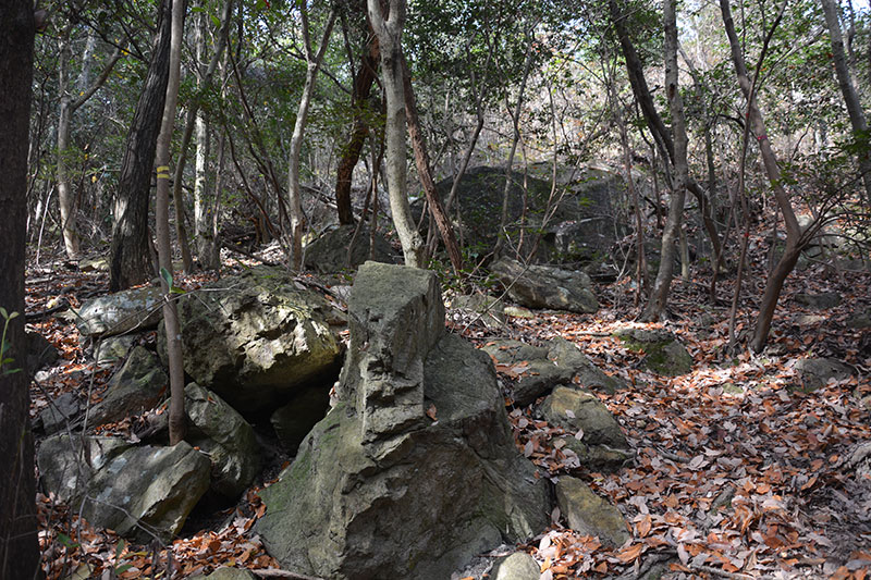 やがて岩の間を縫うように進む場所を通過し、巨岩を左に見上げながら登ると谷から尾根に出ますが、そこには明確な道がありました。