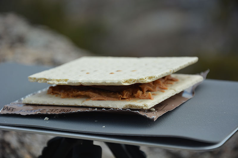 レトルトパウチを温めている間に、付属する2枚のクラッカーにそれぞれピーナツバターとイチゴジャムを塗り、重ね合わせて美味しくいただきました。