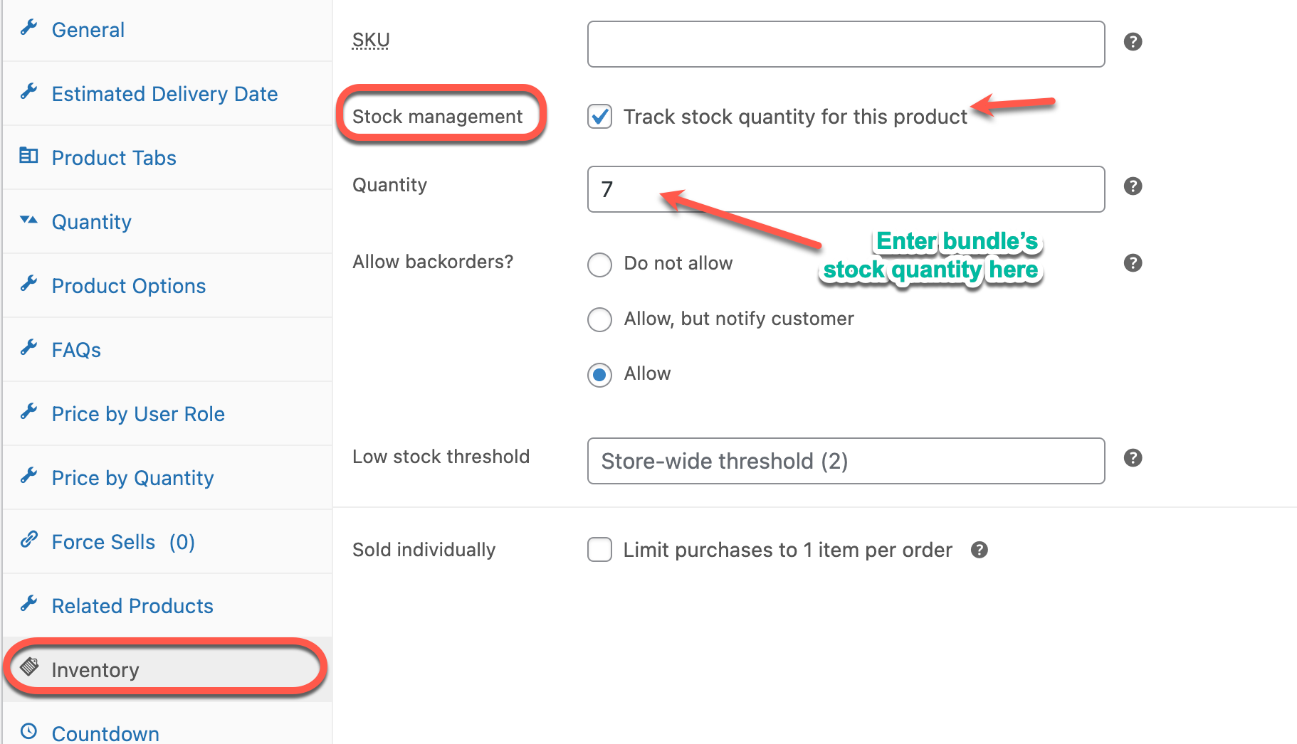 Then go to the Inventory tab, put a check on “Enable the stock management at product level” and set up stock quantity for the bundle.