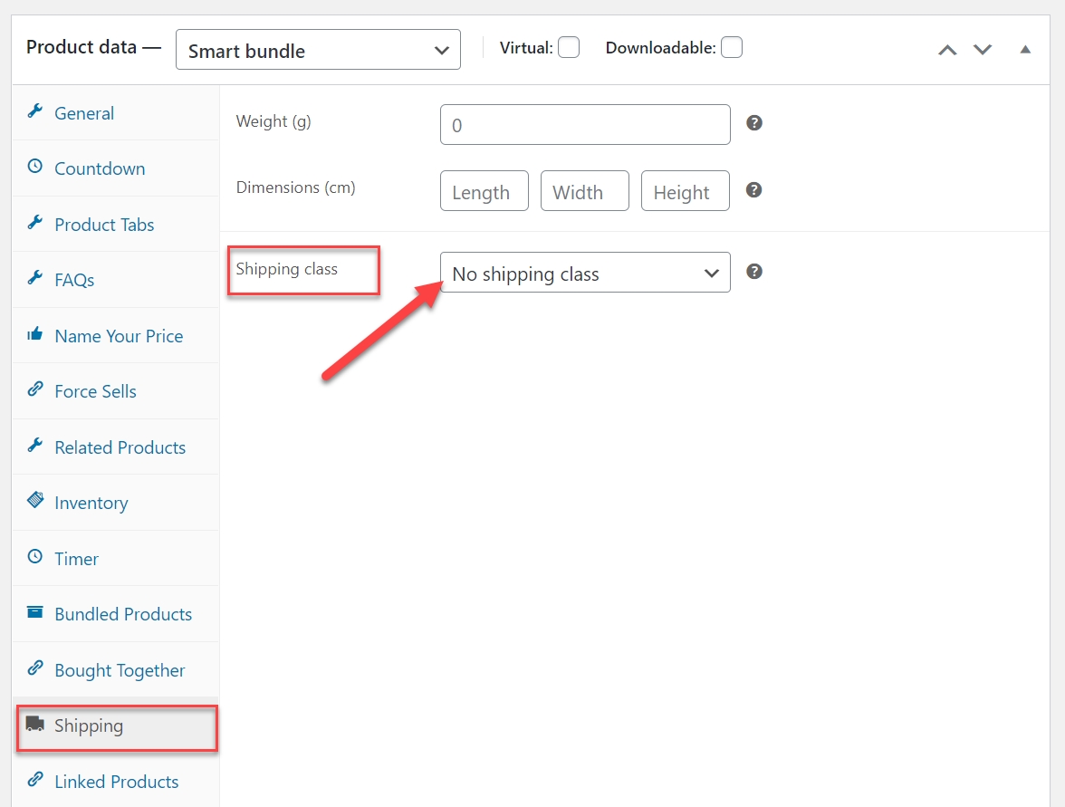 First, open the Shipping tab and choose a Shipping class: