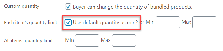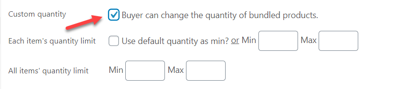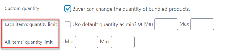Clicking on the Custom quantity box will open up the min/max options. Set up the quantity limit for each item (Each item’s quantity limit) or the whole bundle (All items’ quantity limit) accordingly.
