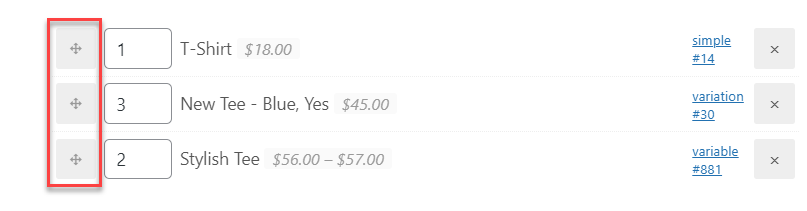 - variation #…: a specific variation of the variable product above it.