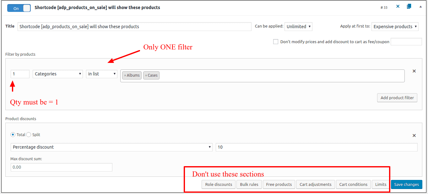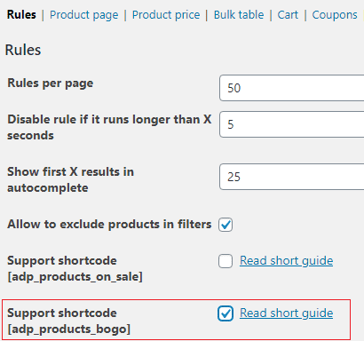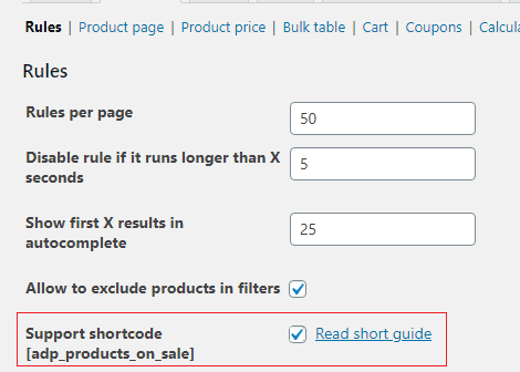 - Support shortcode [adp_products_on_sale]. Use this shortcode to show all the products affected by simple rules on one page.This shortcode supports same parameters as WooCommerce shortcode [products].For example, showing products that have WooCommerce sale price, use the “show_wc_onsale_products” parameter for the [adp_products_on_sale] shortcode.