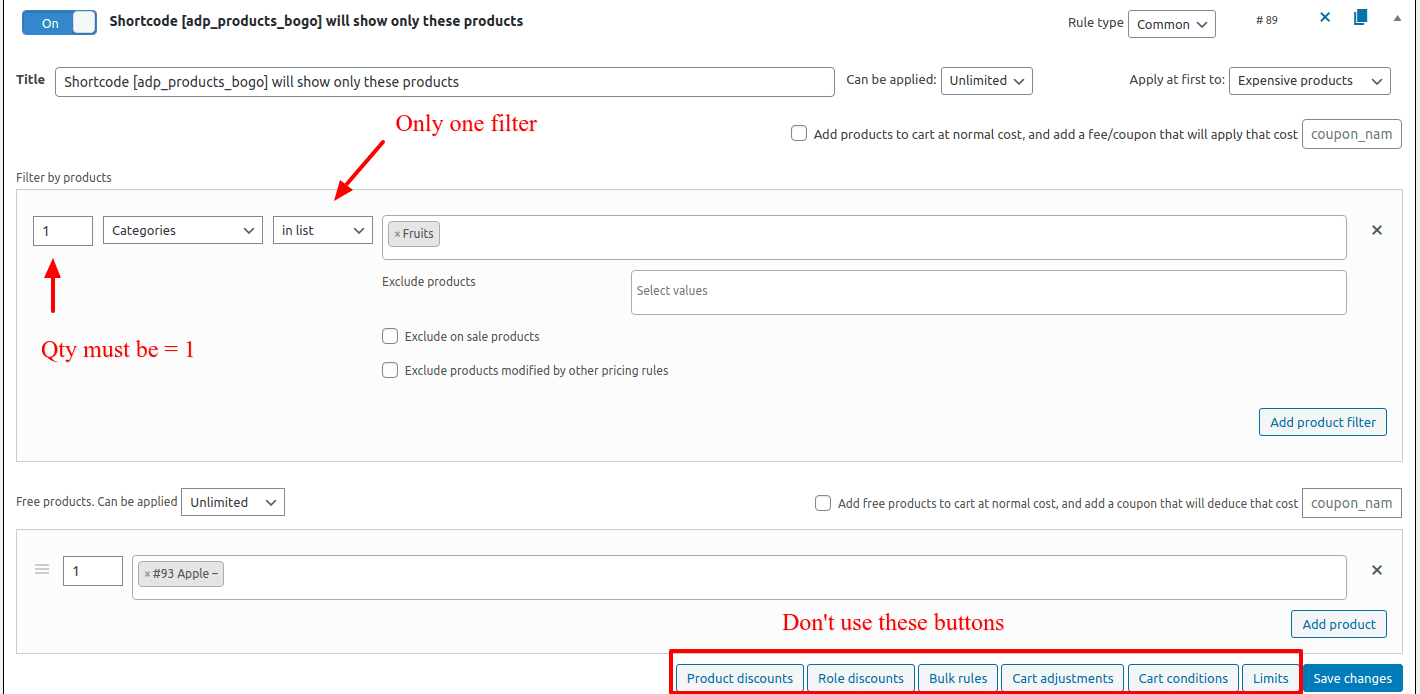 1) Enable “Support shortcode [adp_products_bogo]” sdetting at the tab Settings>Rules2) Create simple rule, using only “Product filter” + “Free product” with the only one filter and “in list” value of the drop-down.