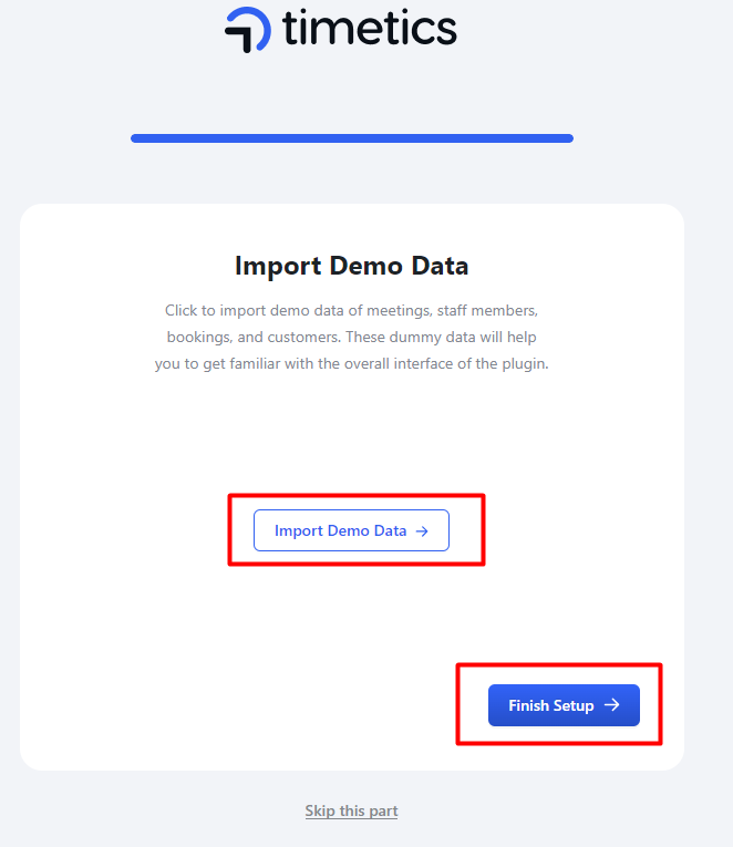 In Timetics, we have added an onboarding feature for the users so that they can easily set their availability and connect with their calendars. When you activate the plugin, you will see the onboarding setup. But you can skip it if you want.