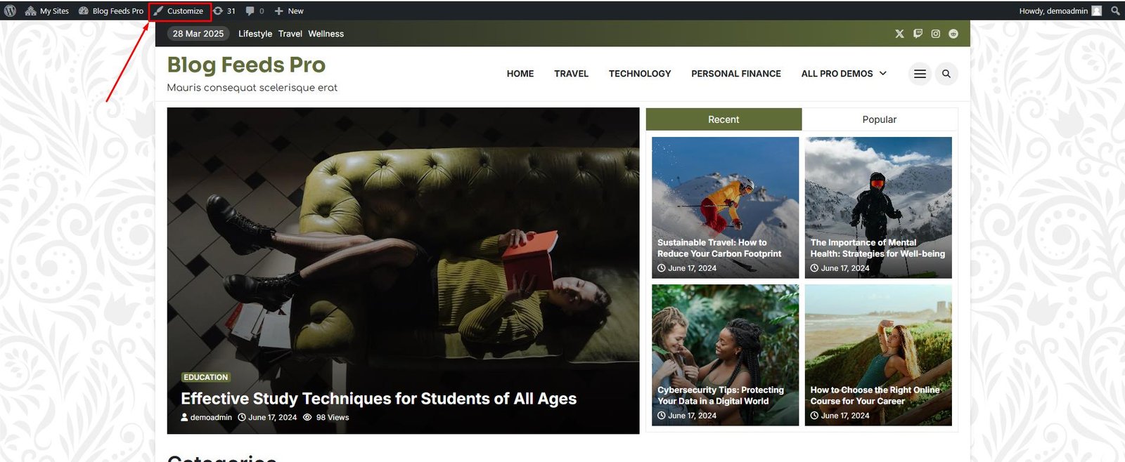 You can access Customize from any page or post on the site, customize option is in the top-left corner, and click on Customize to customize the website.