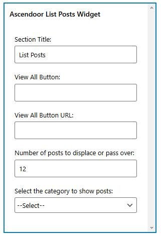- After selecting the widget section Click on the Add a Widget button then select the Ascendoor List Posts Widget the user will see the following options: