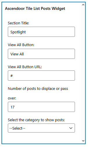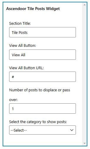 - After selecting the widget section Click on the Add a Widget button then select the Ascendoor Tile Posts Widget the user will see the following options: