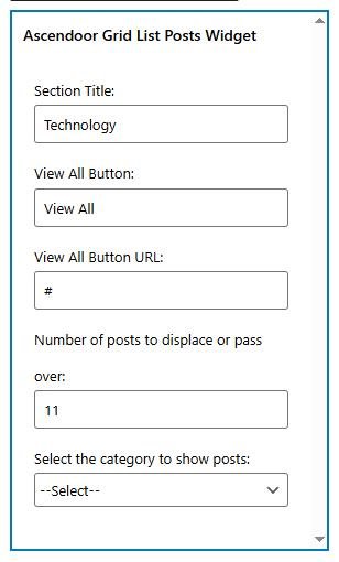 - After selecting the widget section Click on the Add a Widget button then select the Ascendoor Grid Posts Widget the user will see the following options: