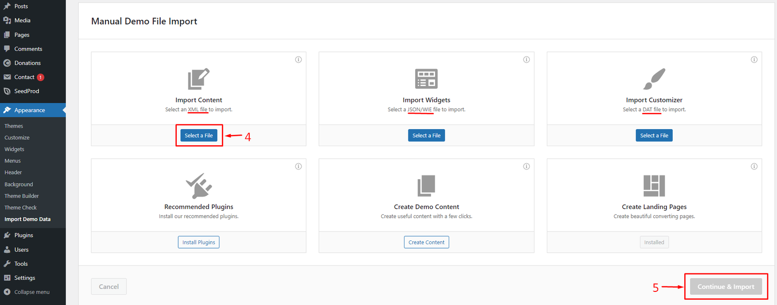 - Now navigate to the Dashboard > Appearance > Import Demo Data > Switch to Manual Import and select respective files for Import Content, Import Widgets, and Import Customizer.