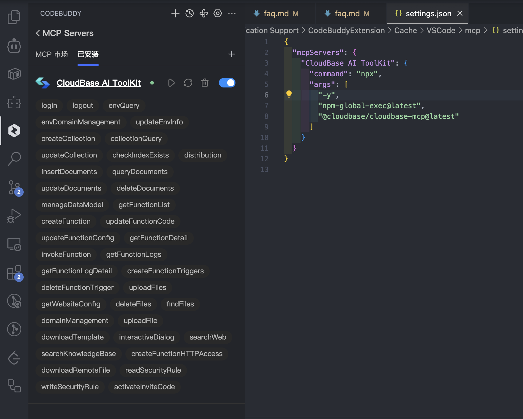安装完成后,CloudBase AI CLI 会自动安装 CloudBase AI Toolkit MCP 服务,并生成全局命令 cloudbase-mcp。