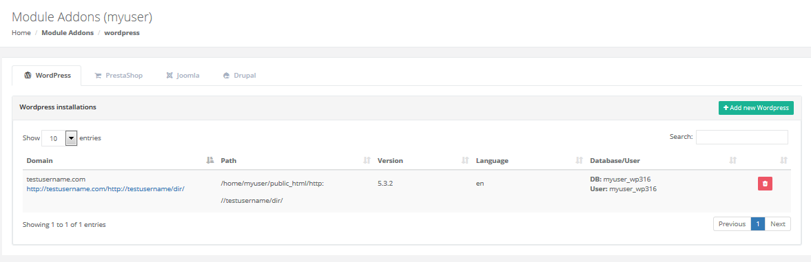WordPress Intallations with your description Domain, Path, Version, Lenguage, Datebase/User and the action to delete.