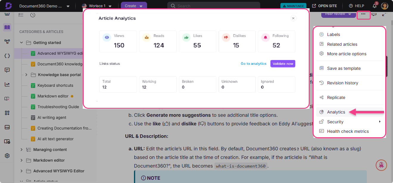 Article Analytics in Document360 provides detailed, article-specific insights, unlike standard Analytics, which offer a broader overview of your entire knowledge base. With Article Analytics, you can track individual article performance across metrics like reads, views, likes, dislikes, following, and link status. These insights help optimize your content strategy and enhance the user experience.