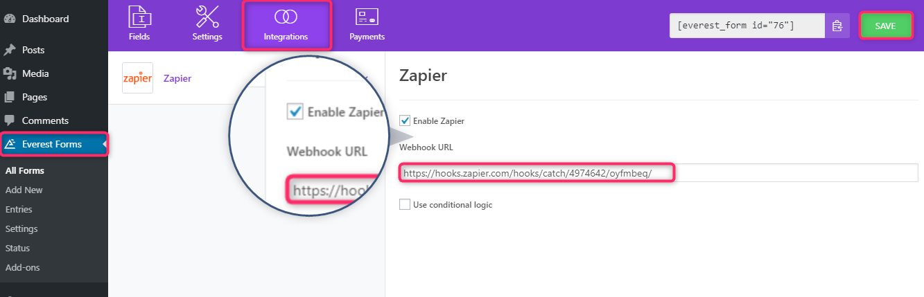 Now, navigate to Everest Forms->Select your form->Settings->Integrations->Zapier. First, check the Enable Zapier option. Then, on Webhook URL, paste your copied webhook.
