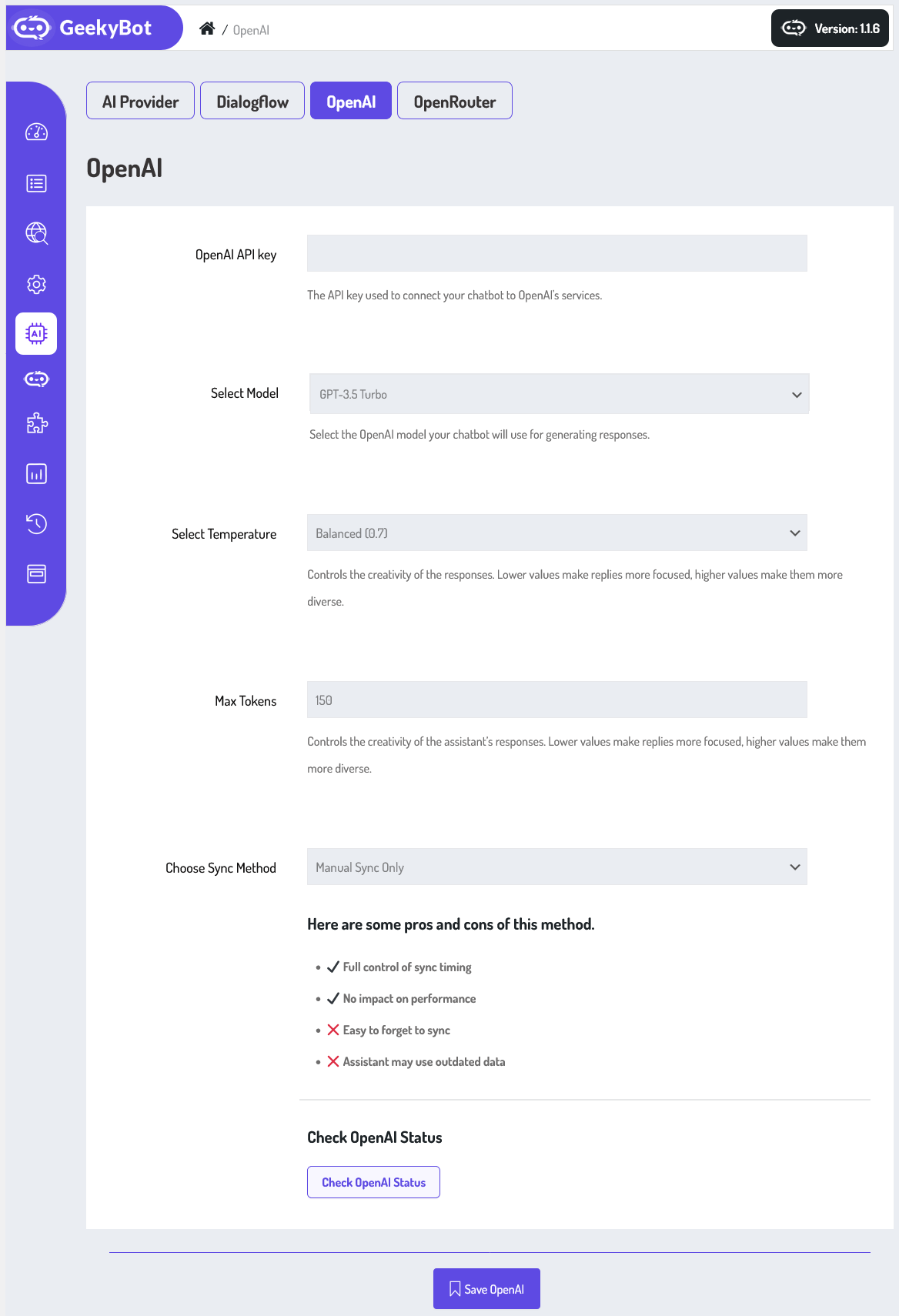 Finally, you can use the Check OpenAI Status button to ensure that your connection to OpenAI is active and operational. This helps in diagnosing issues quickly if your bot suddenly stops responding.
