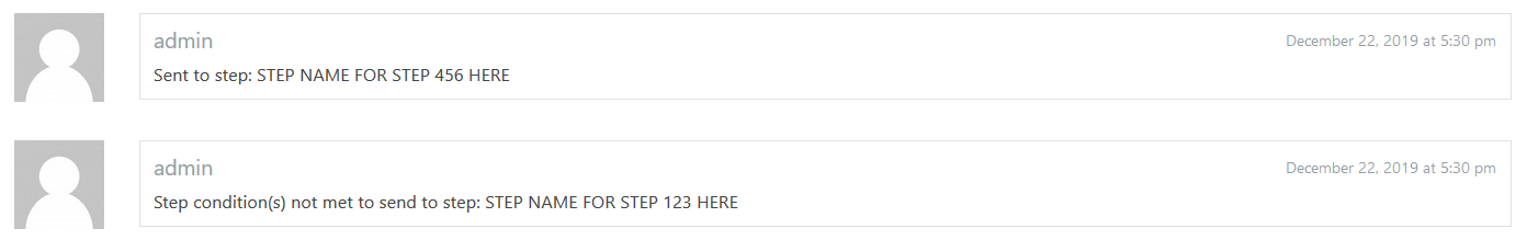 - If a (potential) new step does not meet its’ step conditions a message will be logged to the timeline and subsequent steps after the new step will be checked and if valid will be sent to instead.