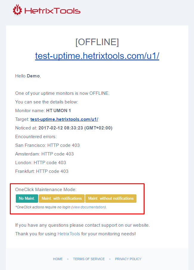 This feature allows you to modify your Uptime Monitor’s maintenance mode status right from the downtime email notification, without the need to log into your account.