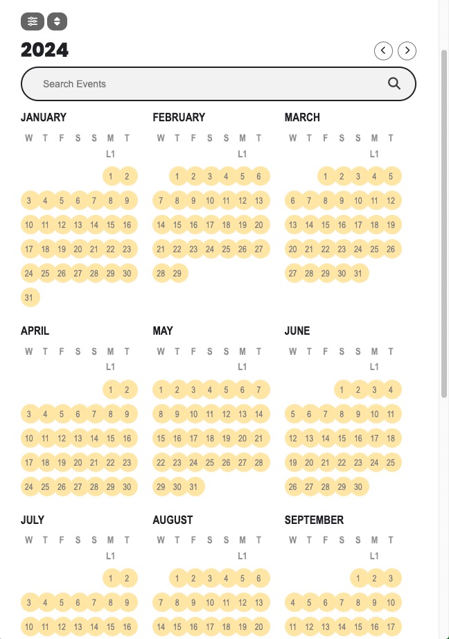 You can display a comprehensive grid/list of the events that span through the year using the following shortcode: