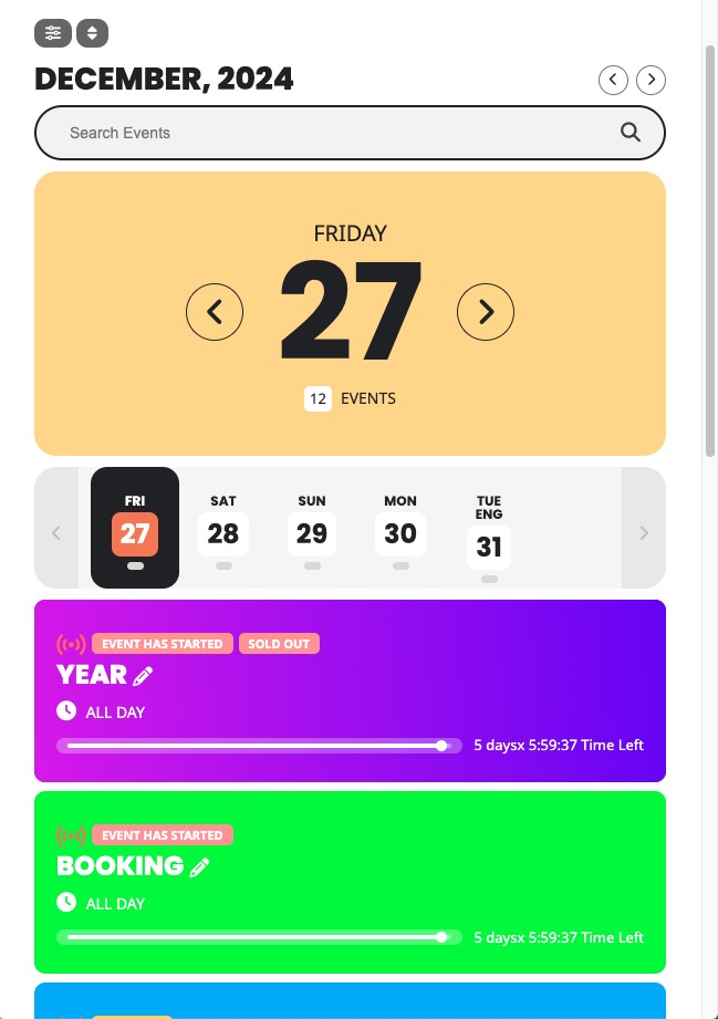 You can display a neat calendar of your events with the main focus being the daily view of events using the shortcode below. You can use arrows to jump to a particular day and also optionally display a month strip.