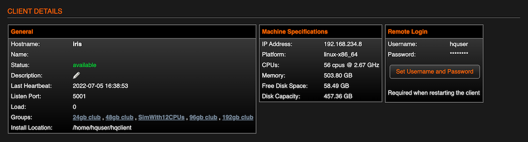 | dots | The dot color indicates the client’s status. Green – available Red – unavailable Orange – currently running jobs Dark grey – offline |