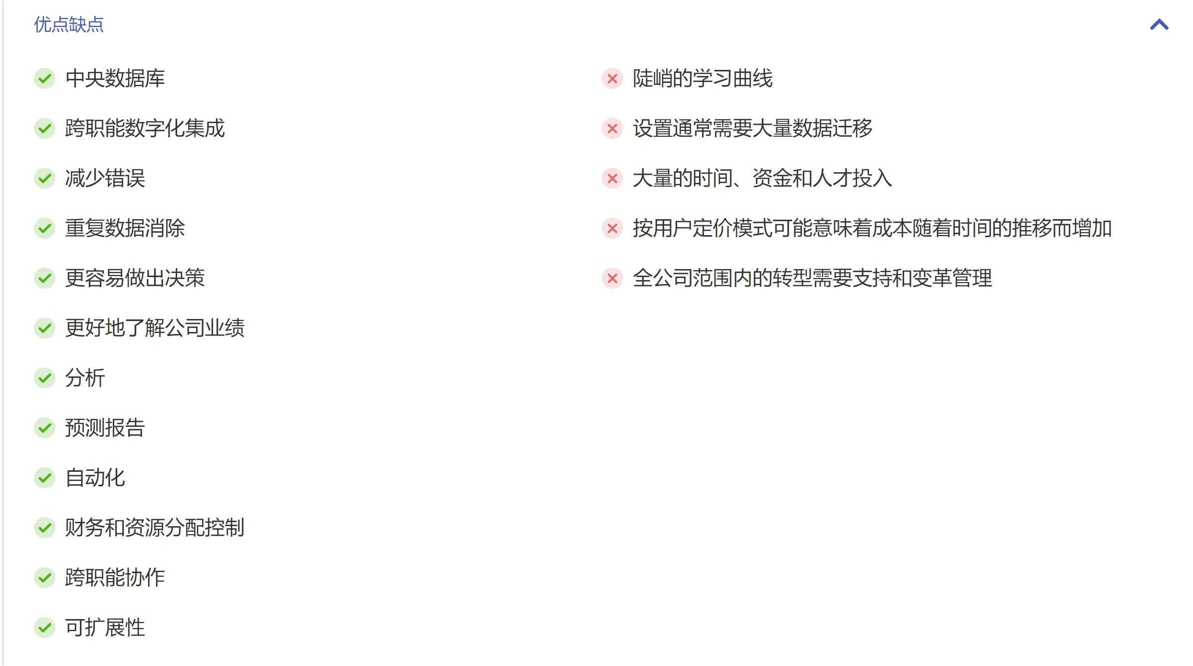 | 竞争对手分析 | 虽然 ERP 系统不提供竞争分析功能,但用户可以通过与公司 CRM 集成等方式生成此功能。 | 许多 CRM 提供了收集竞争对手信息的工具,例如客户、潜在客户或潜在客户如何与竞争对手品牌互动。它还可以根据市场情况聚合内容,包括竞争对手的新闻。 |