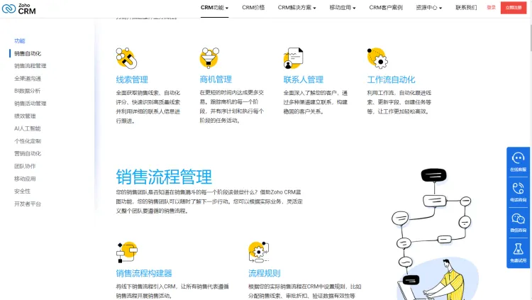 就功能而言: 虽然CRM系统的功能可能每个供应商都不太一样,但大致离不开这么几个功能:营销自动化、客户管理、销售管理、客服管理、报表分析。其中销售自动化功能可以说是每个CRM系统的核心之一。因为其它几个功能都有其它工具可以取代,比如客户管理,小公司完全可以用excel做,客服管理和报表,也有专门的工具。只有销售自动化,是CRM要解决的主要客户痛点问题,而这正是Zoho Crm最出色的地方。