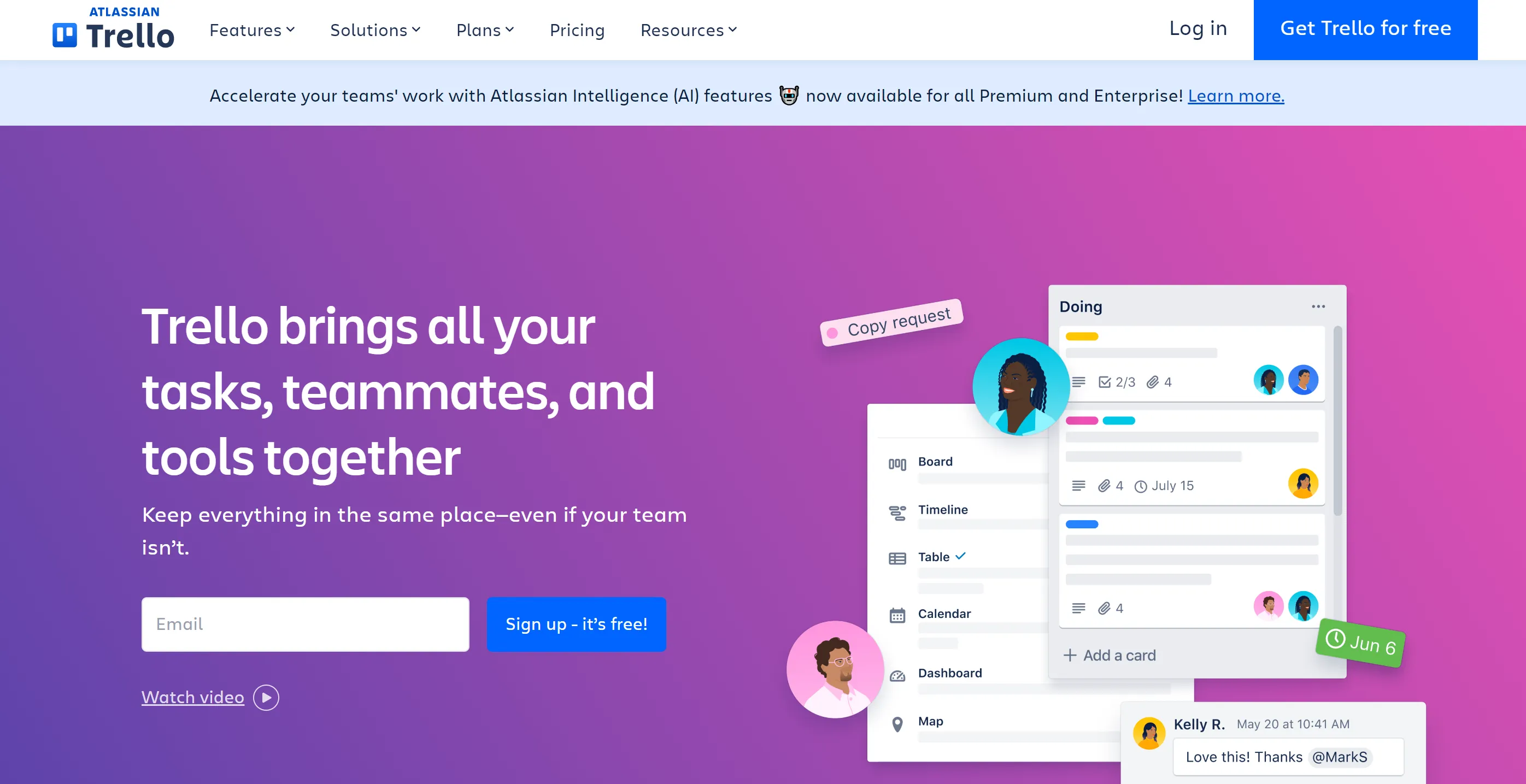 Trello以其简洁的看板视图闻名,适用于需要简单任务管理和团队协作的用户。它支持任务卡片、标签、截止日期和附件功能,并可与多个应用集成。优点是使用简单、直观,但免费版本功能有限。官网:Trello