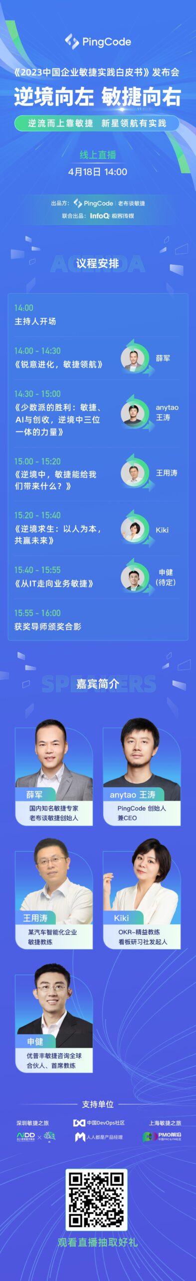 除白皮书发布外,发布会还邀请到老布谈敏捷创始人薛军,PingCode CEO 王涛,以及王用涛、 Kiki、申健等众多国内著名敏捷专家。他们将为大家带来在逆境下国内最新敏捷趋势的洞察、PingCode 在逆境下的敏捷实践,以及国内优秀企业的实践案例。