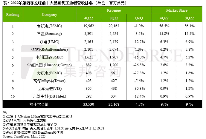 由于三星(Samsung)拥部分iPhone、Android新机零部件拉货动能,稍微抵消客户修正幅度与先进制程订单流失的缺口,第四季营收环比减少约3.5%,达53.9亿美元。值得留意的是,TrendForce集邦咨询观察到三星7nm(含)以下先进制程客户高通(Qualcomm)、英伟达(NVIDIA)旗舰新品转单出走,但尚无量体相当的新客户填补产能,将导致三星2023全年先进制程产能利用率约60%处低迷水位,2023年营收成长动力恐不足。