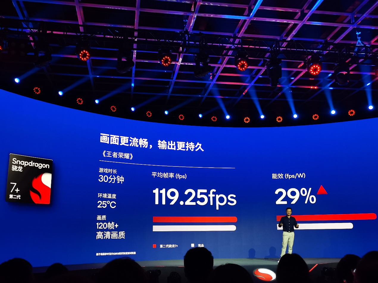 在原神须弥城路线的实际测试中,连续测试30分钟,环境温度25摄氏度,720p画质条件下,第二代骁龙7+比竞品的平均帧率高出10%,能效名列前茅17%;而在王者荣耀的对比测试中,选择连续测试30分钟,环境温度25摄氏度,测试高清画质120帧配置,第二代骁龙7+的平均帧率达到了119.25fps,能效相比竞品名列前茅了29%,意味着玩家可以在更长的时间里体验到稳定的高帧率游戏表现。