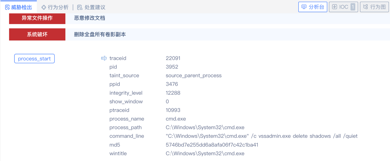 为防止受害者从系统的卷影副本中恢复数据,勒索软件还执行命令删除了系统上的卷影副本。