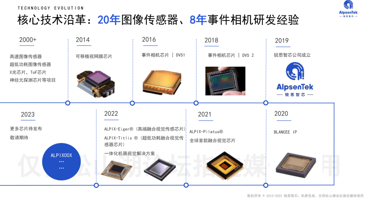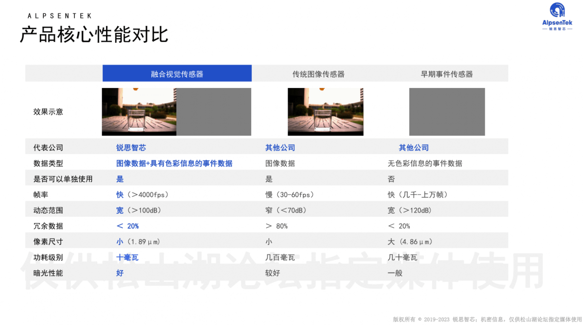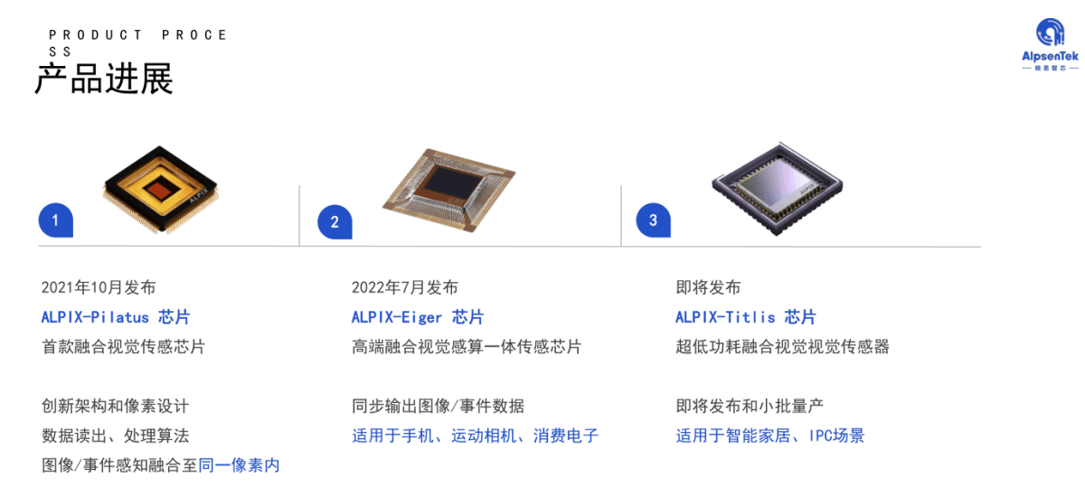 2021年10月份,锐思智芯发布了首款基于Hybrid Vision融合视觉技术的芯片,主要是用于验证融合方案的。随后在2022年7月,发布了首款高端融合视觉感算一体传感芯片ALPIX-Eiger,主要是适用于智能手机、运动相机等消费电子产品。