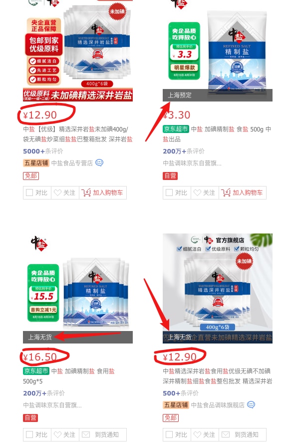 据报道称,北京生鲜超市的线上平台,在消息过后的两小时内,原本供应量充足的食盐直接显示无货,笔者也在24日晚间搜索上海地区的JD生鲜发现不仅价格翻了一倍,还多数显示无货。