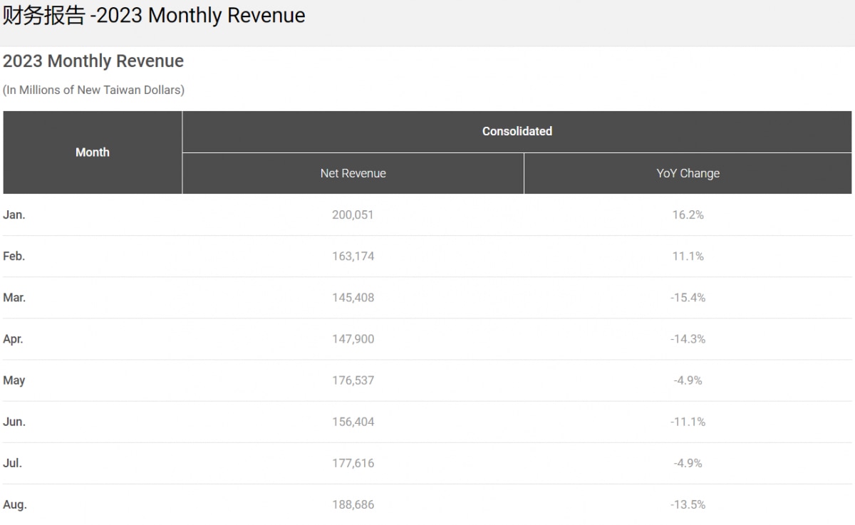 今年的前8个月,台积电的营收仅1月份和2月份同比有增长,已连续6个月同比下滑,这也导致他们今年前8个月13557.77亿新台币的营收,不及去年同期的14301.12亿,同比下滑5.2%。