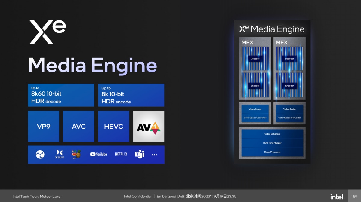 此外,Xe显示引擎、媒体引擎主要都位于SoC tile上,并没有放在Graphics tile上。媒体引擎支持最高8k60 10bit HDR解码,8k30 10bit HDR编码;格式方面,主流的VP9, AVC, HEVC, AV1都有支持。