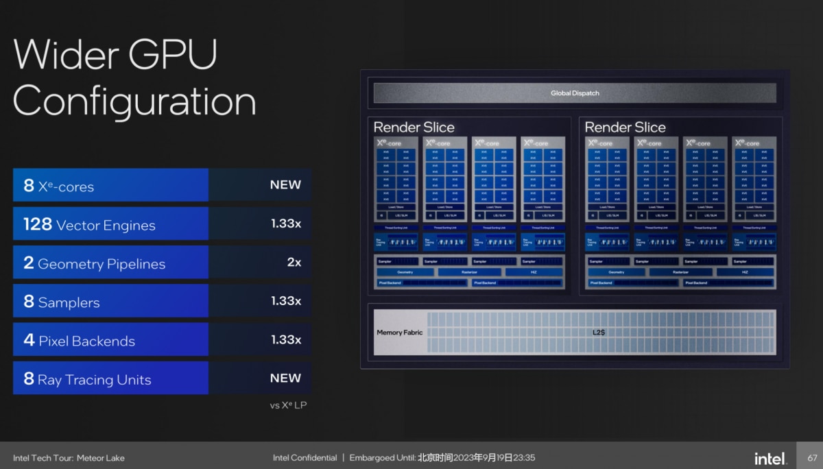 当然每个Xe核心对应的有一个光线追踪单元,看来往后光追是真的要普及了。Intel在酷睿Ultra处理器核显上,将RTU作为标准件推广,对于其自身的光追和图形生态发展也相当有好处。不过基于Embree的Blender光追性能测试提升,Intel给的提升数据是相比CPU渲染提升2.5倍左右的性能,其实就光追部分来看还是挺弱的。