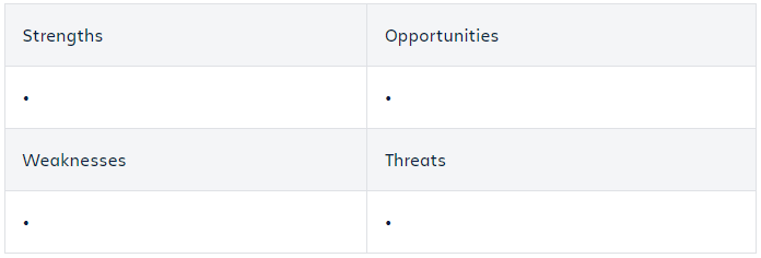 战略规划和项目规划有很多相似之处,不过战略规划的范围更广,更加关注公司整体。但战略规划有一些独特的活动,这些活动将帮助领导团队制定出真正能够支持公司愿景的计划。 SWOT分析 SWOT分析包括识别公司的优势、劣势、机会和潜在威胁。最常见的方式是使用一个二乘二的矩阵来对这些不同因素进行分类和说明。