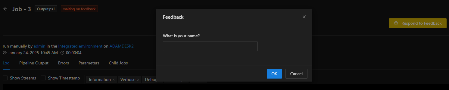 Some jobs will require feedback. Any script that contains a `Read-Host` call will wait until there is user interaction with that job. The job will be in a Waiting for Feedback state, and you can respond to that feedback by click the Response to Feedback button on the job page.