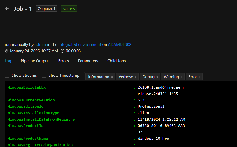 Standard PowerShell streams such as information, host, error, warning and verbose are shown within the output pane.