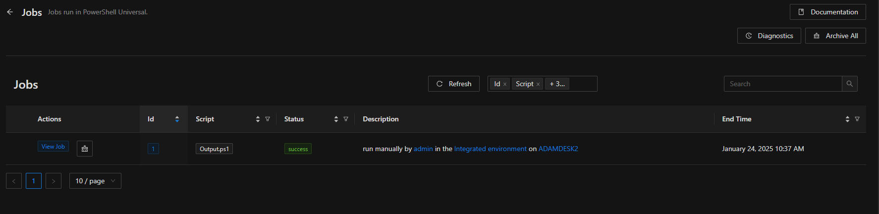 Pipeline output for jobs is also stored within PowerShell Universal. Any object that is written to the pipeline is stored as CliXml and available for view within the Pipeline Output tab.