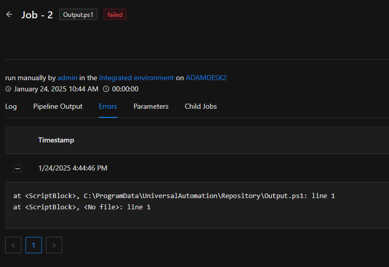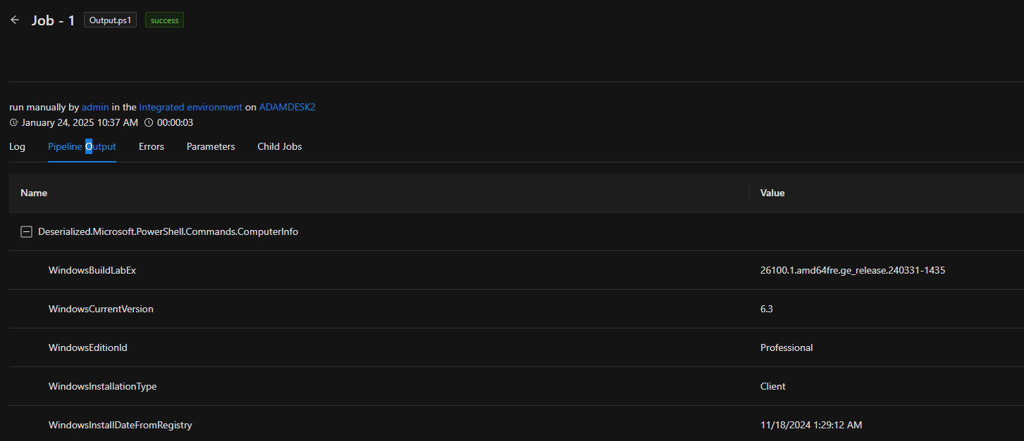 It may be required to return the output from a script's last job run. In order to do this, you will need to use a combination of cmdlets to retrieve the script, the last job's ID and then return the pipeline or host output.