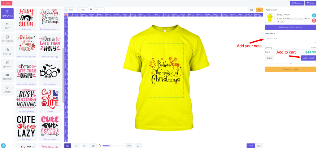 After check all info and design ok. You can add your note for shop manager and click Add to cart button