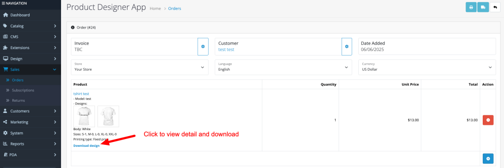 To check design on order. You need create new order have design -> Go to admin panel -> Opencart -> Orders (1) -> Click on order to open detail (2)