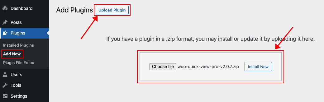 After the download, you’ll find the files in a zip folder on your computer named woo-quick-view-pro.zip. Please follow the steps below to install the “WooCommerce Quick View Pro” version.