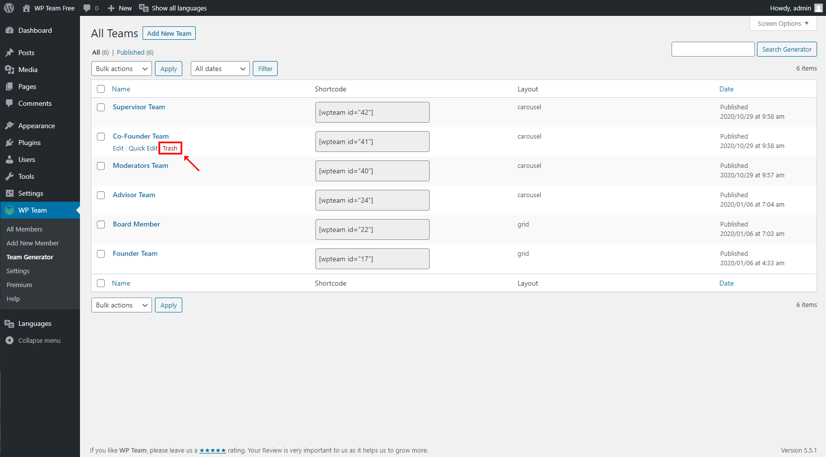 - Go to WP Team→ Shortcode Generator.