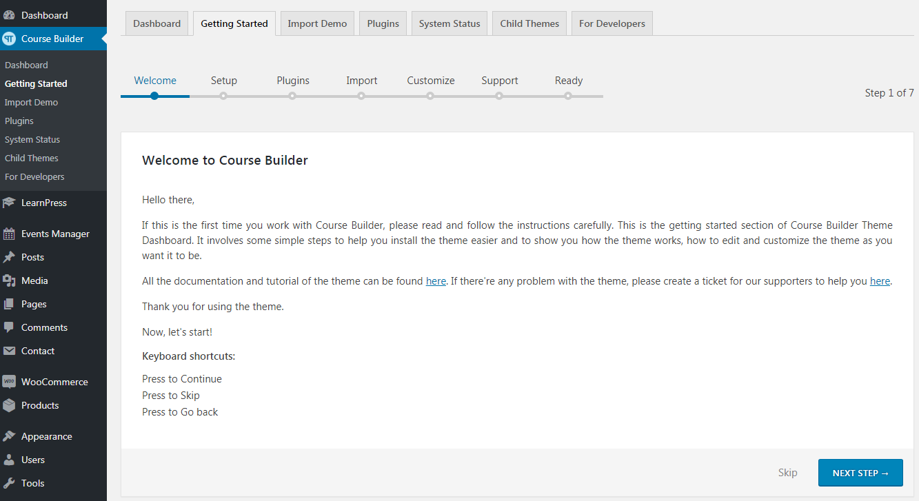 After the theme successfully installed and activated, you will see the Course Builder theme dashboard with our welcome message. Click ‘Next step’ and follow the instructions to set up your site: